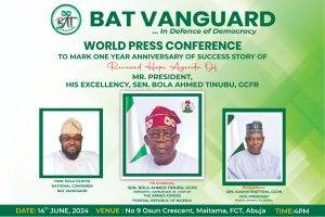The National Convener of Bola Ahmed Tinubu (, BAT) Vanguard has declared in a World Press Conference today in the Nation Capital, Abuja, that President Bola Ahmed Tinubu, GCFR has done wonderfully well considering the fact that he inherited a very sick economy Hon. Sola Olofin , who was joined by Barrister Onyoche Lawani, the National Secretary, Comrade Dare Balogun, National Publicity Secretary, Dr. O’Diakpo Obire and a lot of BAT Vanguard Executives and members, said further, “Today marks another great day for us at Bola Ahmed Tinubu Vanguard (BAT Vanguard) to gather and present our assessments of the socio-political events that have taken place under the present administration ablely led by our Grand Patron and the Political Godfather of our group- BAT Vanguard, His Excellency, President Bola Ahmed Tinubu, GCFR.